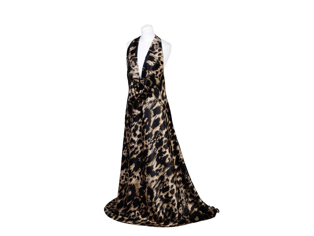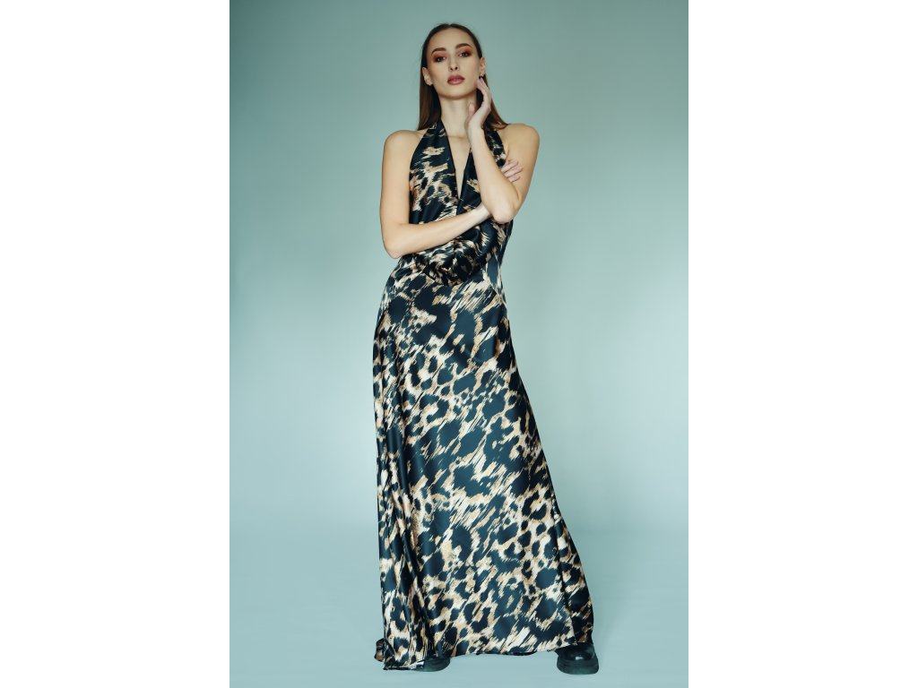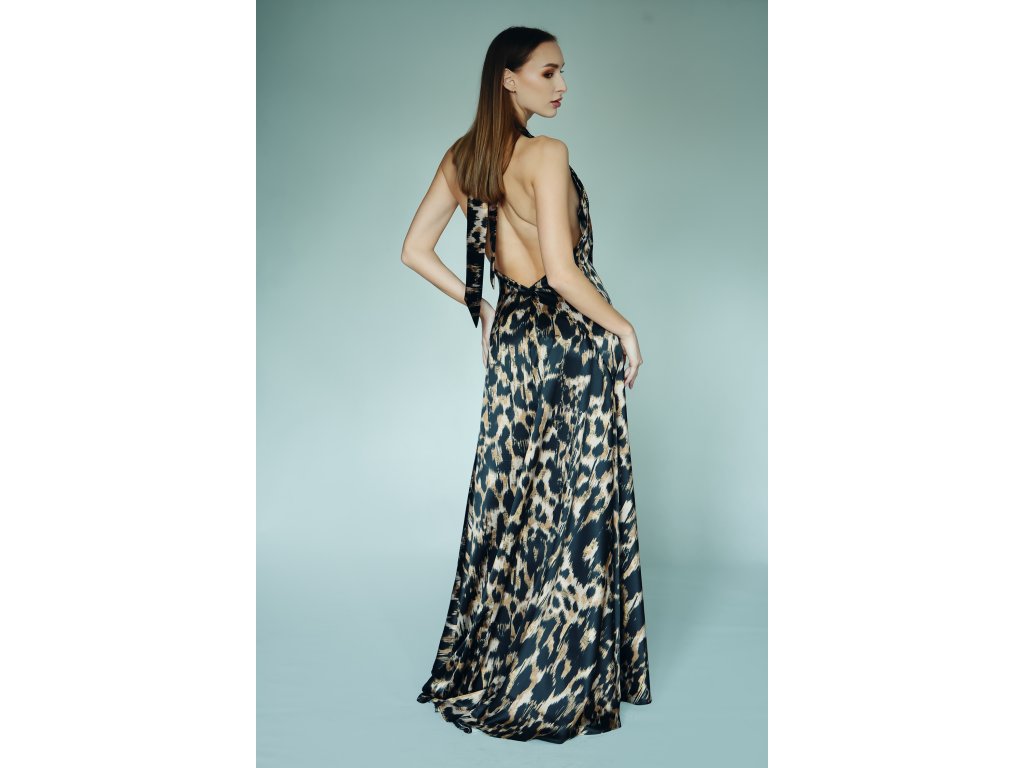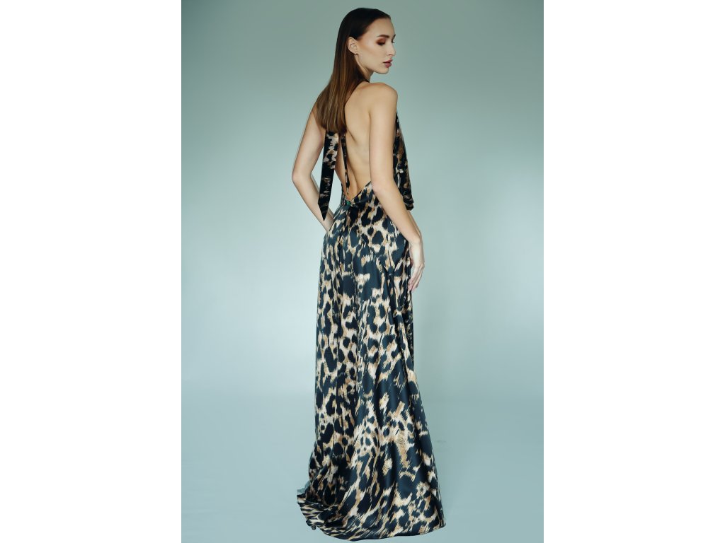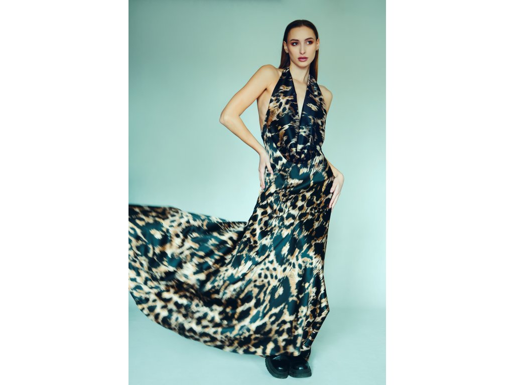 Spoločenské šaty pre ženy, ktoré vedia čo chcú. Hlboký výstrih s vodou, holý chrbát a viazanie ku krku, bohatá sukňa, ktorá ale nechá vyniknúť bokom, dramatický vzor, to všetko z Vás spraví hviezdu eventu.