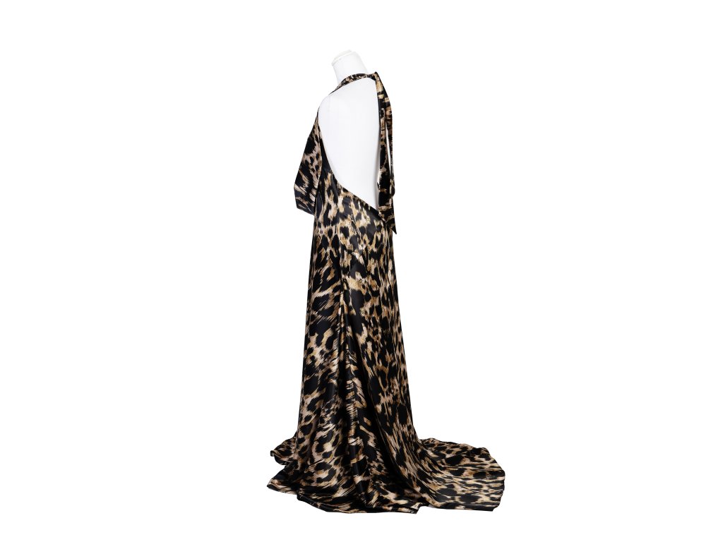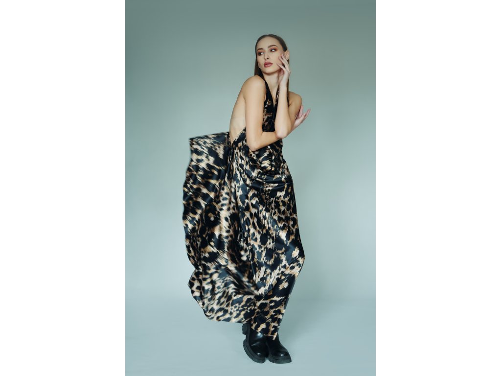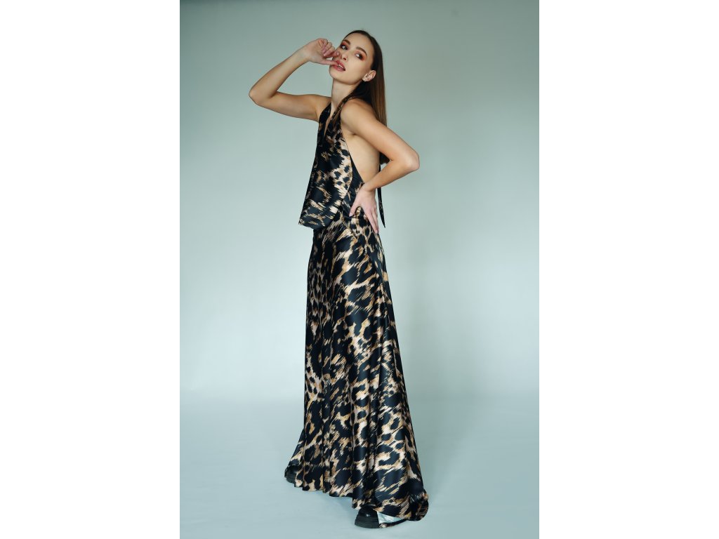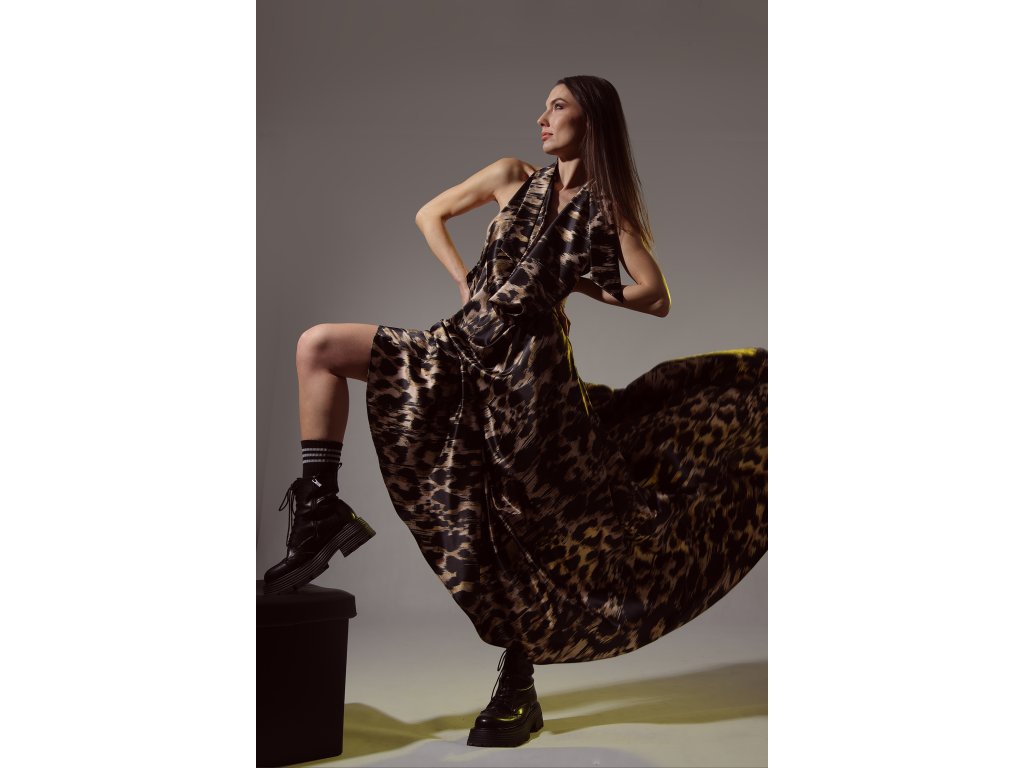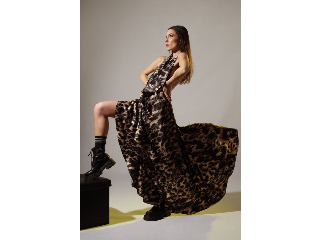 Spoločenské šaty pre ženy, ktoré vedia čo chcú. Hlboký výstrih s vodou, holý chrbát a viazanie ku krku, bohatá sukňa, ktorá ale nechá vyniknúť bokom, dramatický vzor, to všetko z Vás spraví hviezdu eventu.